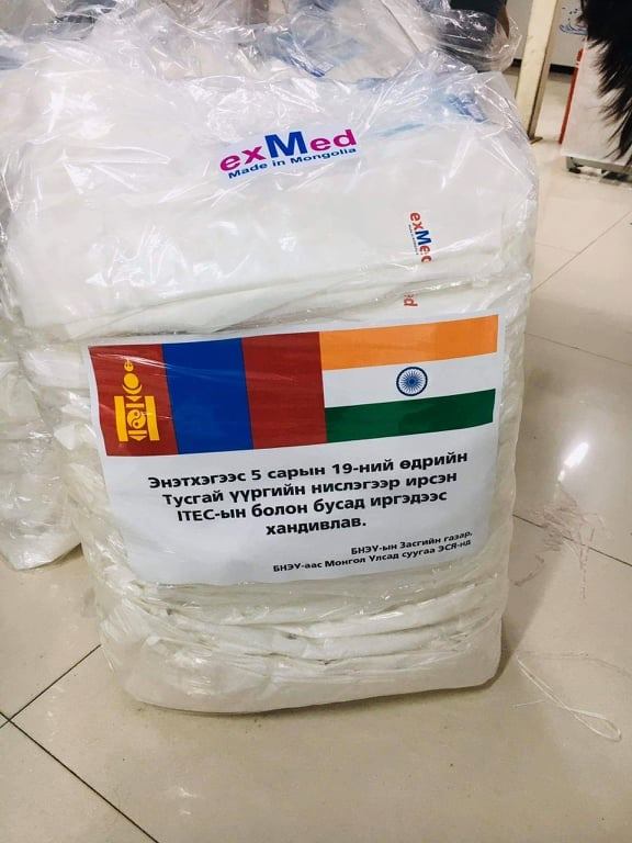 Энэтхэгээс ирсэн иргэд 3 хоногийн хандивын аяныг дотооддоо цахим группээр дамжуулан зохион байгуулж, аяны хүрээнд цугларсан 4.0 сая гаруй төгрөгөөр үндэсний үйлдвэрлэгч “Exclusive” ХХК-ийн Европын орнууд руу захиалгаар нийлүүлж буй exMed сайн чанарын нэг удаагийн хамгаалах хувцаснаас 240 ширхгийг худалдан авч, тэнцүү хуваан УОК болон Энэтхэгийн ЭСЯ-нд тус бүр 120 ширхгийг хүлээлгэн өгч байгаа ажээ.