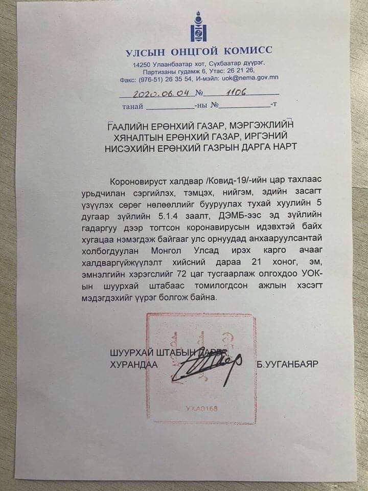 Улсын онцгой комиссоос коронавирусийн халдвартай холбогдуулан хэд хэдэн шийдвэр гаргажээ. Монгол Улсад ирэх карго ачааг 21 хоног халдваргүйжүүлэлт хийсний дараа, эм, эмнэлгийн хэрэгслийг 72 цаг тусгаарлаад эзэнд олгохоор шийдвэрлэв.