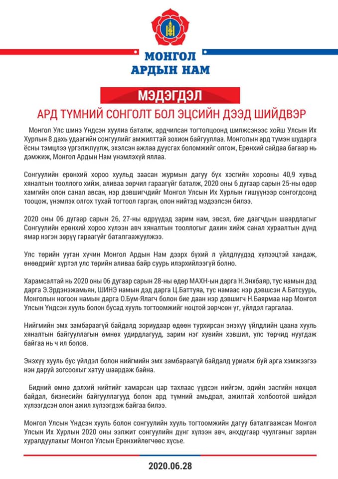 МАН-ынхаа энэхүү Мэдэгдлийг манай намын бүх гишүүд ард түмэнтэйгээ хамт бүрэн дүүрэн дэмжиж байна. Ард түмний мэргэн ухаан, шударга зөв сонголтыг бусад нам, эвслүүд, бие даагчид хүндэтгэж, Үндсэн хуулиа дагаж сахин мөрдөх ёстой!
