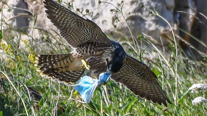 Стив Шифли хэмээх эр Их Британийн Йоркшир арал дээр гэрэл зураг авч байхдаа хөлд нь нэг удаагийн амны хаалт орооцолдсон шонхор шувууны дүрсийг буулгаж авчээ. Байн байн нисэн бууж, хөлөө амны хаалтаас салгах гэж чармайх шувууны дүр зурагчин залуугийн сэтгэлийг эмзэглүүлжээ.