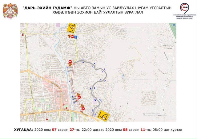 БЗД-ийн 27-р хороо, 2-р хороо "Дарь-Эхийн гудамж"-ны 3.3км автозамыг шинэчлэх ажлын хүрээнд уг замыг 2020 оны 07-р сарын 27-ны 22:00 цагаас эхлэн хааж засвар, шинэчлэлтийн ажил хийгдэнэ. Эхний ээлжинд "Ус зайлуулах шугам, хоолой"-г суурилуулахтай холбогдуулан тус хэсгийн автозамыг 2020 оны 07-р сарын 27-ны 22:00 цагаас 08-р сарын 10-ны 08:00 цаг хүртэл бүрэн хаах тул тус замаар хөдөлгөөнд оролцох боломжгүйг анхааруулж байна. Иймээс тус орчинд амьдардаг ард иргэд гудамж дундуурх, доорх зурган дээрх замыг сонгон хөдөлгөөнд оролцоно уу.