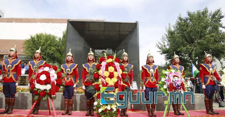 Яг одоо Монгол Улсын Ерөнхийлөгч Х.Баттулга, Ерөнхий сайд У.Хүрэлсүх, УИХ-ын дарга Г.Занданшатар нар Хэлмэгдэгсдийн хөшөөнд цэцэг өргөж байна.
