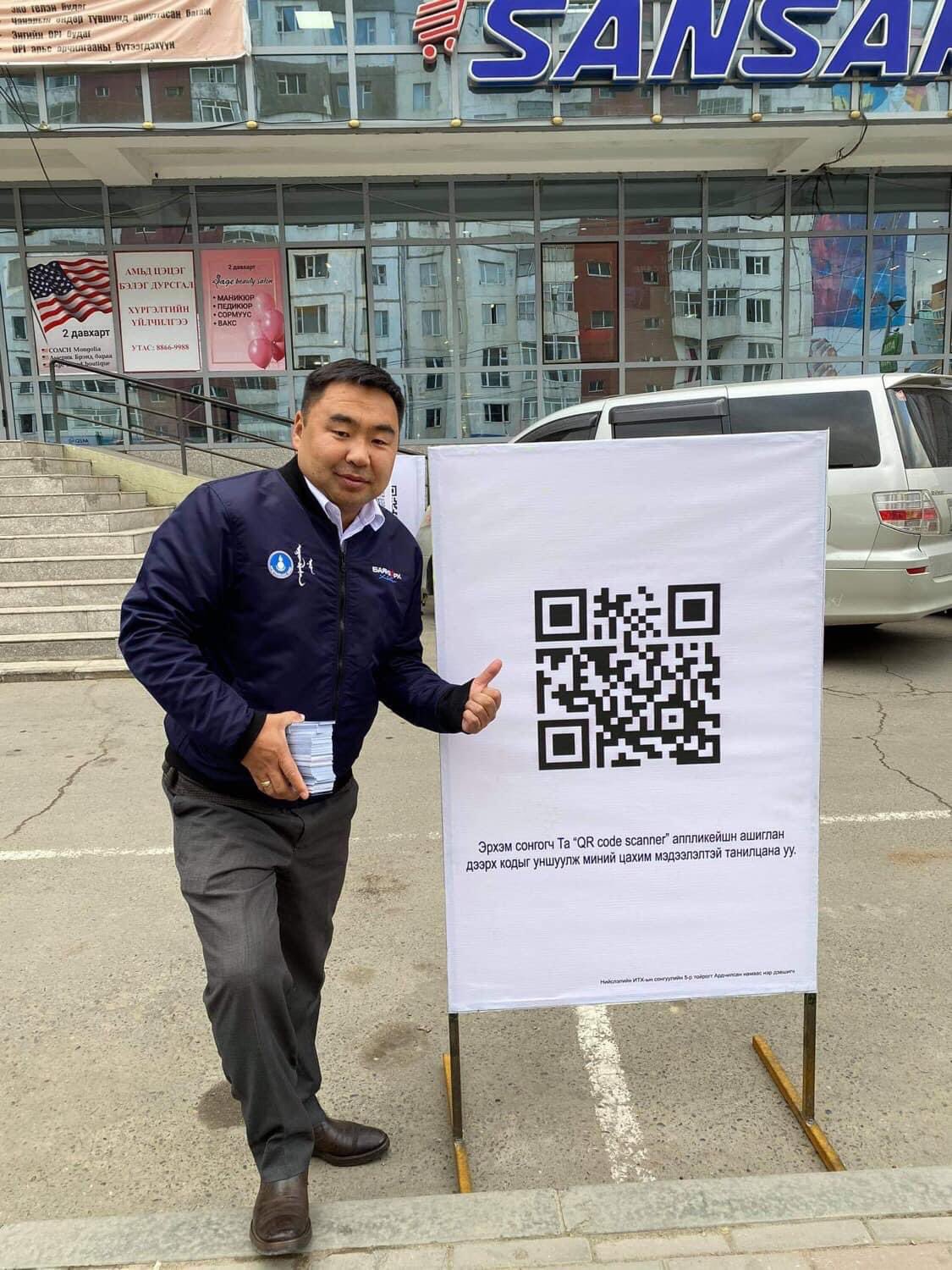 НИТХ-ын сонгуулийн 5-р тойрогт, Баянзүрх дүүргээс нэр дэвшигч Т.Энхбаяр сурталчилгааны самбараа орчин үелэг, өвөрмөц хэв маягаар хийжээ. Өөрийнхөө ямар ч нэр, зураггүй, зөвхөн QR код бүхий самбар байршуулж, доор нь “Эрхэм сонгогч та аппликейшн ашиглан дээрх кодыг уншуулж, миний цахим мэдээлэлтэй танилцана уу” гэж бичсэн байна.