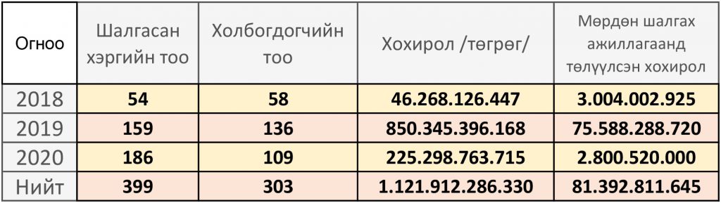 ЦЕГ: 2017-2020 ОНУУДАД 1.1 ИХ НАЯД ТӨГРӨГИЙН ХОХИРОЛТОЙ 399 ХЭРЭГТ МӨРДЛӨГ ЯВУУЛЖ, 81.3 ТЭРБУМЫГ НӨХӨН ТӨЛҮҮЛСЭН