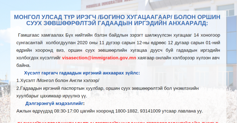 Гамшгаас хамгаалах Бүх нийтийн бэлэн байдлын зэрэгт шилжүүлсэн хугацааг 14 хоногоор сунгасантай холбогдуулан 2020 оны 11 дүгээр сарын 12-ны өдрөөс 12 дугаар сарын 01-ний өдрийн хооронд виз, оршин суух зөвшөөрлийн хугацаа дуусаж байгаа гадаадын иргэдийн холбогдох хүсэлтийг [email protected] цахим хаягаар хүлээн авч байна.