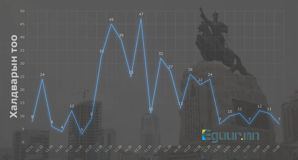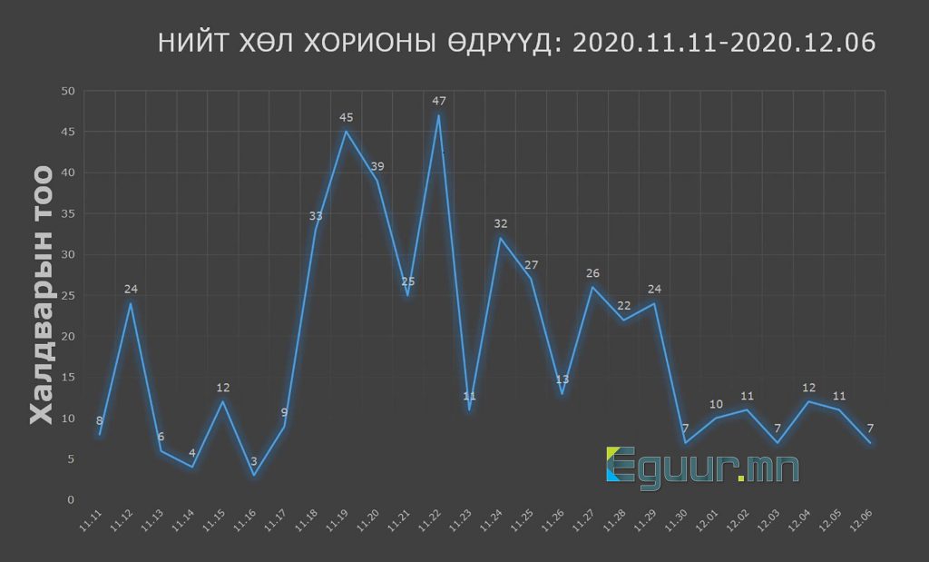 Анхлан хөл хорио тогтоосон арваннэгдүгээр сарын 11-нээс хамгийн сүүлд шинэчлэгдсэн мэдээлэл бүхий арваноёрдугаар сарын 6-ны өдөр хүртэлх нийт 26 өдрийн графикыг харуулж байна.