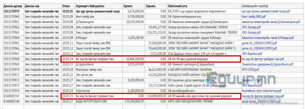 Ийнхүү “Зам тээврийн хөгжлийн төв” ТӨҮГ-ын шилэн дансны мэдээлэлд дурдсанаар тавдугаар сарын 14-нд 90 сая, 15-нд 110 үлдэгдэл сая төгрөгийг хоёр хуваан шилжүүлсэн байна.