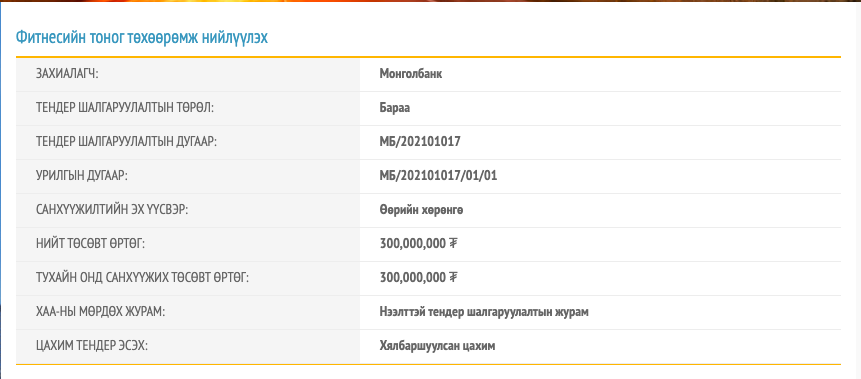 Энэ оны хоёрдугаар сарын 1-ний өдөр Монголбанкнаас 300 сая төгрөгийн өртөгтэй, фитнесс төхөөрөмж худалдан авах тендер зарлажээ.