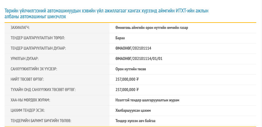 Өмнөговь аймгийн Орон нутгийн өмчийн газраас, тус аймгийн ИТХ-ын ажлын албаны автомашиныг шинэчлэх тухай тендер зарлагджээ. Зарлагдсан огноо энэ оны нэгдүгээр сарын 29 бөгөөд тендерийн материал хүлээн авах хугацаа гуравдугаар сарын 1-нээр дуусах юм байна.