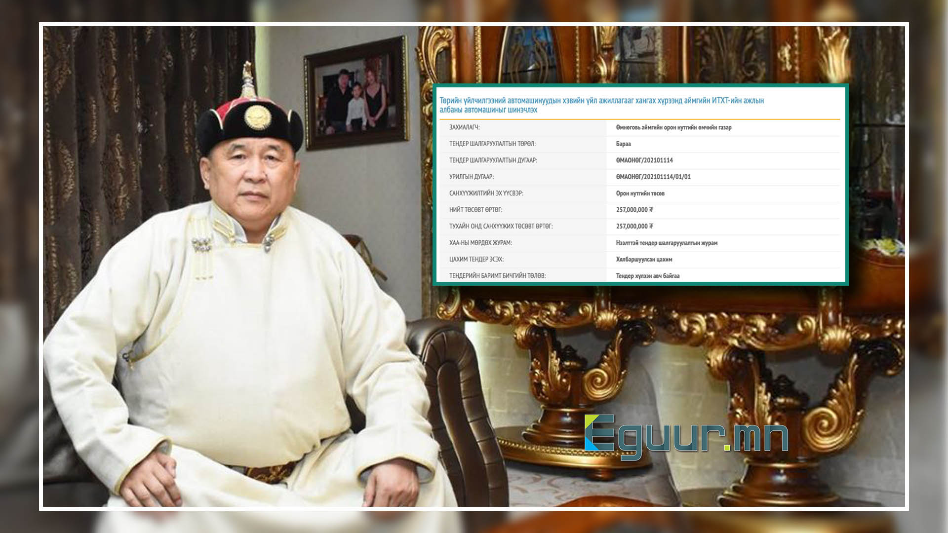 Барааны үнийн дүн 275 сая төгрөг. Харин тендерийн урилгатай танилцвал, “Автомашиныг шинэчлэх” гэх нэрийн хүрээнд “Lexus-LX 570” маркийн автомашин худалдан авахаар зарлажээ.