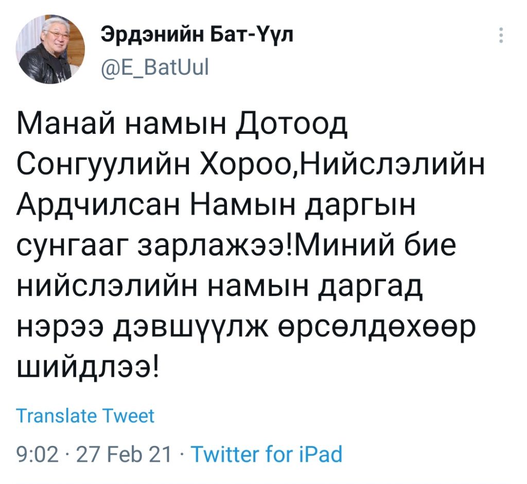 Тэрбээр “Манай намын Дотоод Сонгуулийн Хороо, Нийслэлийн Ардчилсан Намын даргын сунгааг зарлажээ. Миний бие нийслэлийн намын даргад нэрээ дэвшүүлж өрсөлдөхөөр шийдлээ” гэсэн байв.