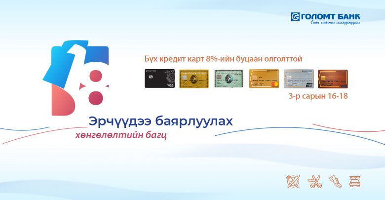 Харилцагч та 2021.03.16-18-ны өдрийг дуустал хамтрагч үйлчилгээний байгууллагуудын Голомт банкны карт уншигч төхөөрөмж дээр Голомт банкны кредит картаар худалдан авалт хийгээд энэхүү урамшуулалд оролцоорой. Таны худалдан авсан бүтээгдэхүүн үйлчилгээний үнийн дүнгийн 8%-ийн буцаалт 2021.03.26-ний дотор төлбөр хийсэн кредит карт руу тань орно.