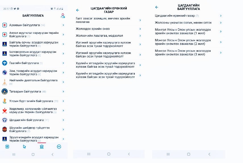 Монгол Улсын Засгийн газрын 2018 оны “Төрийн үйлчилгээг цахим хэлбэрээр үзүүлэх зарим арга хэмжээний тухай” 259, 2019 оны “Төрийн үйлчилгээний талаар авах зарим арга хэмжээний тухай” 149, 2020 оны “Төрийн үйлчилгээний нэгдсэн системийн талаар авах зарим арга хэмжээний тухай” 90 дугаар тогтоолд цагдаагийн байгууллагаас үзүүлэх 12 төрлийн үйлчилгээ, лавлагааг олгохоор заасан.
