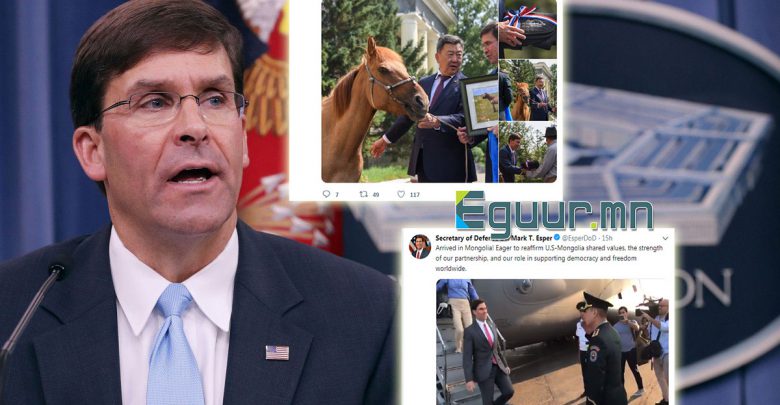 АНУ-ын Батлан хамгаалан яамны сайд, Пентагоны тэргүүн Марк Эспер өнөөдөр /2019.08.08/ Монгол улсад айлчлал хийж буй. Тэрбээр шинэхэн ажлаа хүлээж авсан даруйд нэр бүхий улсуудаар айлчлал хийхээр төлөвлөсний дотор манай орон багтсан юм.