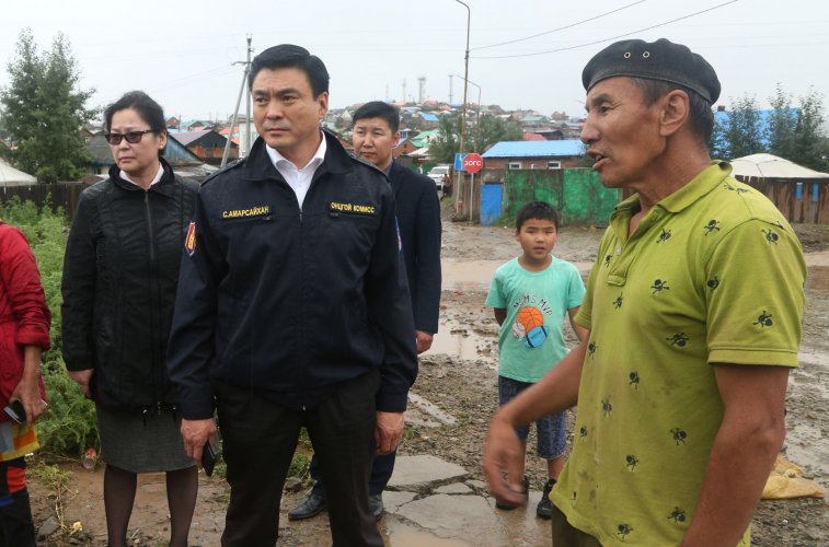 Нийслэлийн Засаг дарга бөгөөд Улаанбаатар хотын Захирагч С.Амарсайхан тэргүүтэй албаны хүмүүс Баянзүрх дүүргийн 8, 12 дугаар хорооны нутаг дэвсгэрт ойрын өдрүүдэд үргэлжлэн орсон усархаг борооны улмаас тэр орчмын айл өрх, гудамж талбай үерийн усанд автсан нөхцөл байдал дээр очиж ажилласан байна.