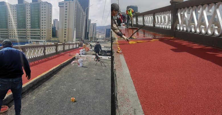 Энхтайваны гүүрний явган хүний замыг резинээр хучиж байна