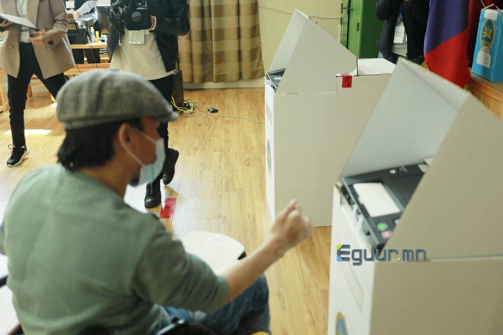 Тэрбээр хөгжлийн бэрхшээлтэй иргэдэд зориулсан санал авах хэсэгт сонголтоо дугуйлж, саналаа өглөө. Гар муутай хэдий ч, саналын хуудсаа нямбай дугуйлахаар хичээж байгаа харагдав. Ийнхүү саналаа өгөөд гарч ирсний дараа түүнтэй хэсэг ярилцлаа.