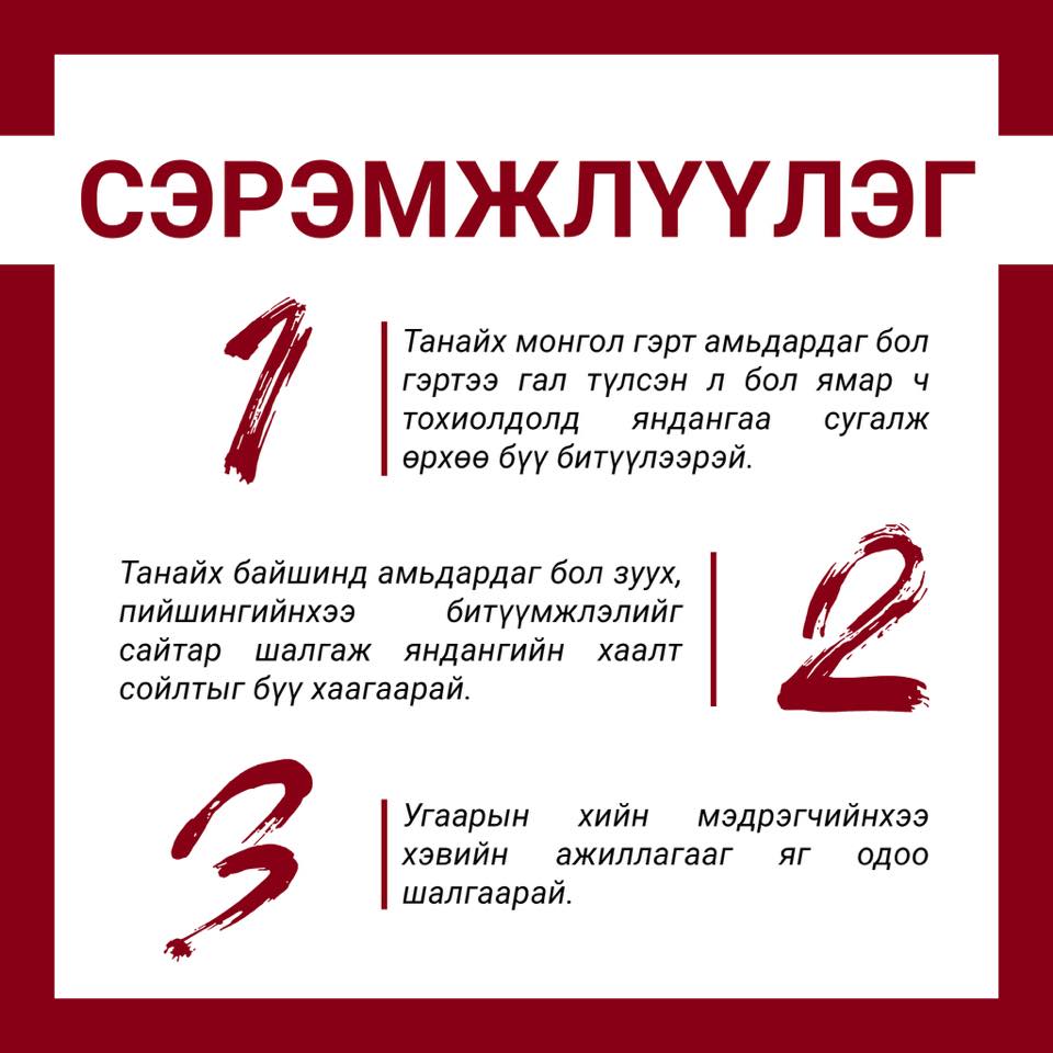 Ойрын өдрүүдэд бороо орж цаг агаар төдийлэн дулаарахгүй байгаагаас гэр хорооллын айл өрхүүдийн галлагаа зогсохгүй байна. Монгол гэрт амьдардаг айл өрхүүд бороо орох үед яндангаа сугалж, өрхөө битүүлснээс үүдэн угаартах эрсдэлд орж байгаа тул дараахь сэрэмжлүүлгийг хүргэж байна.