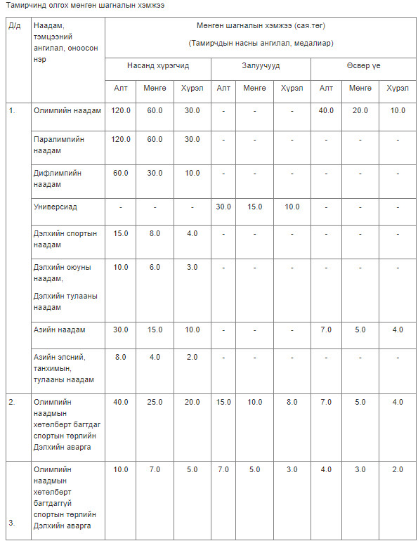 - 1.2.2. үе үеийн олимпийн наадам (зуны олимп, өвлийн олимп, паралимпийн наадам), дэлхийн аварга шалгаруулах тэмцээнээс олимпийн жин, зайд медаль хүртсэн Монгол Улсын иргэнд насан туршид нь сар бүр мөнгөн урамшуулал олгоно.