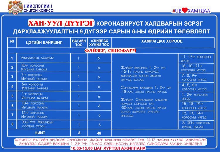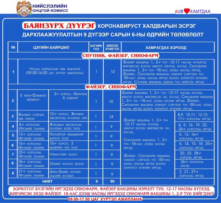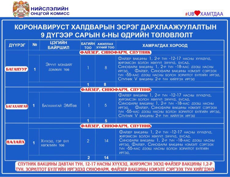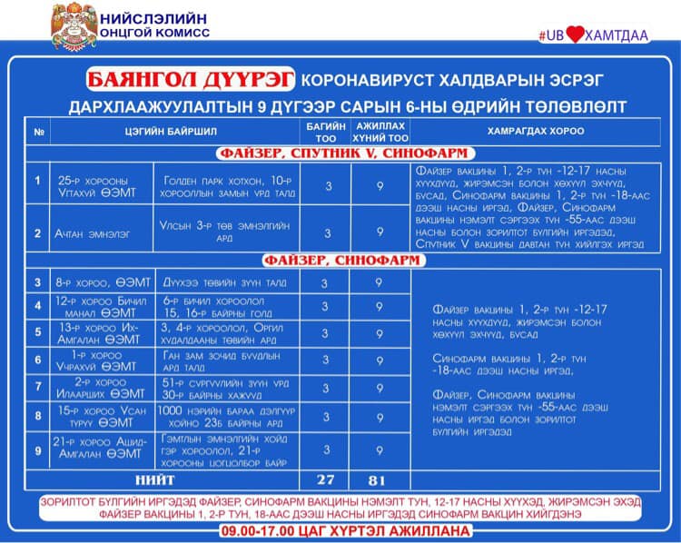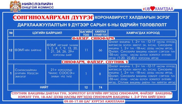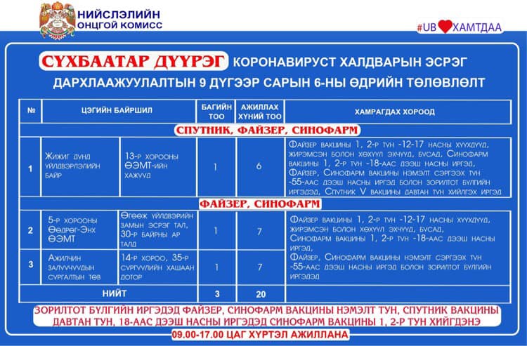 Өнөөдөр 2021.09.06-нд Улаанбаатар хотод явуулын 4, суурин 58 цэгт 84 багийн 429 эмч, ажилтан ажиллаж байна. Тодруулбал, өнөөдөр 7178 иргэнийг дархлаажуулахаар төлөвлөжээ. Дархлаажуулалтын цэгүүд 09:00-17:00 цаг хүртэл ажиллана.