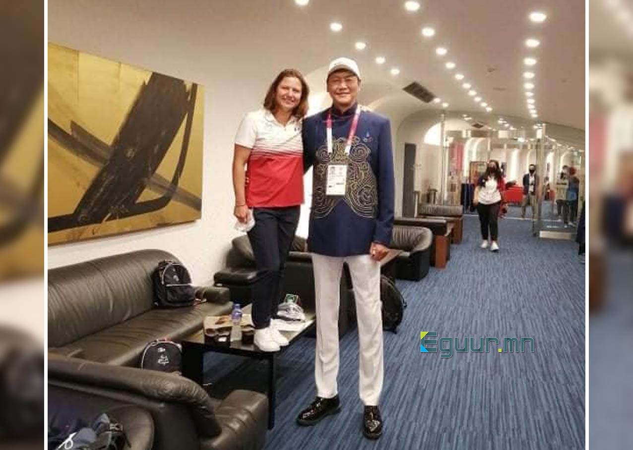 Монголын Биеийн тамир спортын хорооны дарга Ц.Шаравжамц, Францын спортын сайд нар хамт зураг даруулжээ. Та бүхний харж байгаачлан Францын спортын сайд Роксана Марасиняню Ц.Шаравжамцтай зургаа татуулахын тулд ширээн дээр гарч зогссон байна.