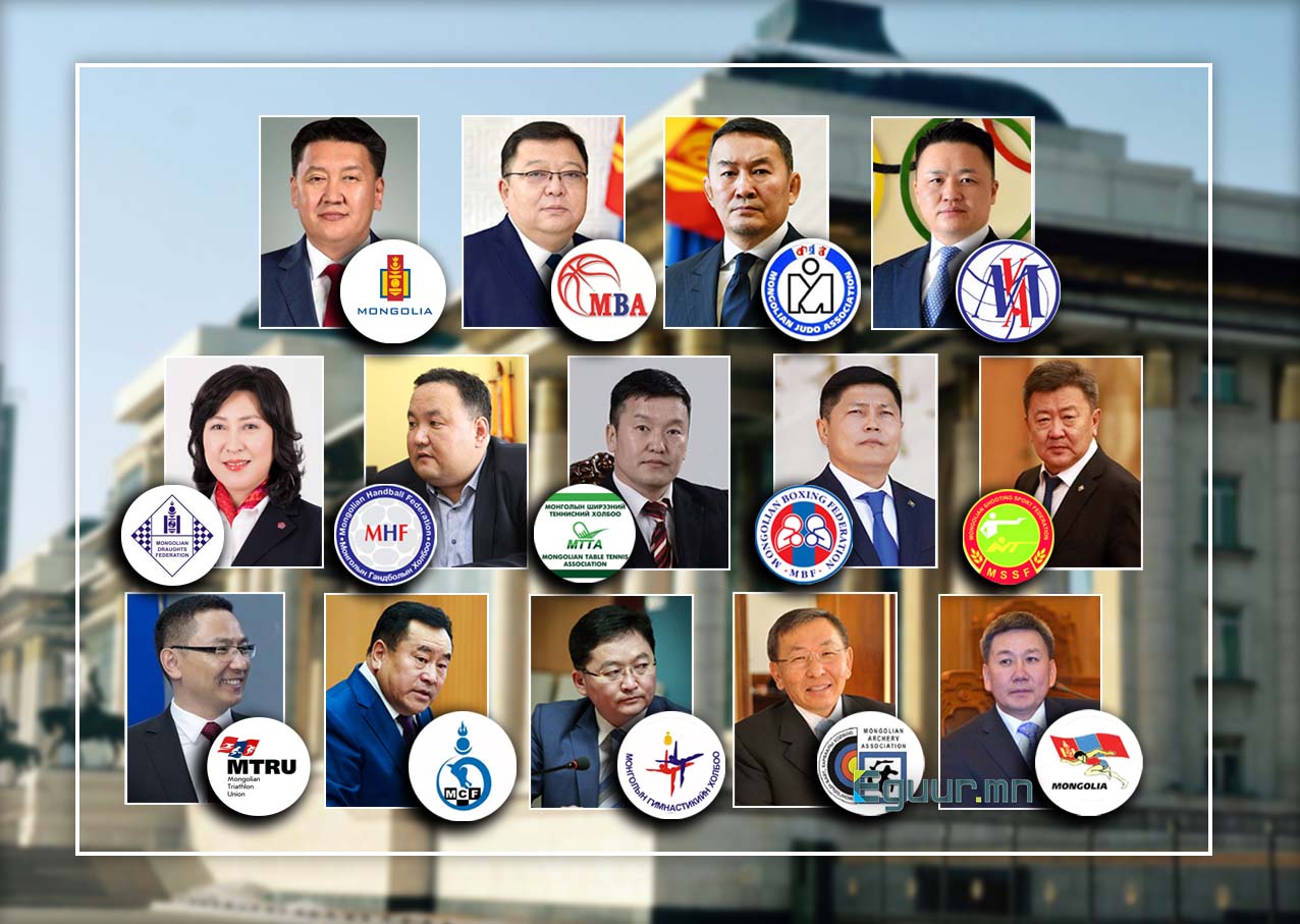 Мөн УИХ-ын гишүүн асан, АН-ын даргаар УДШ-д бүртгэлтэй байдаг С.Эрдэнэ Монголын Үндэсний Сагсан бөмбөгийн холбоог удирдаж байна. Цаашлаад Ерөнхийлөгч, УИХ-ын гишүүн, сайд асан Х.Баттулга Монголын Жүдо бөхийн холбоог удирдсан хэвээр байна.