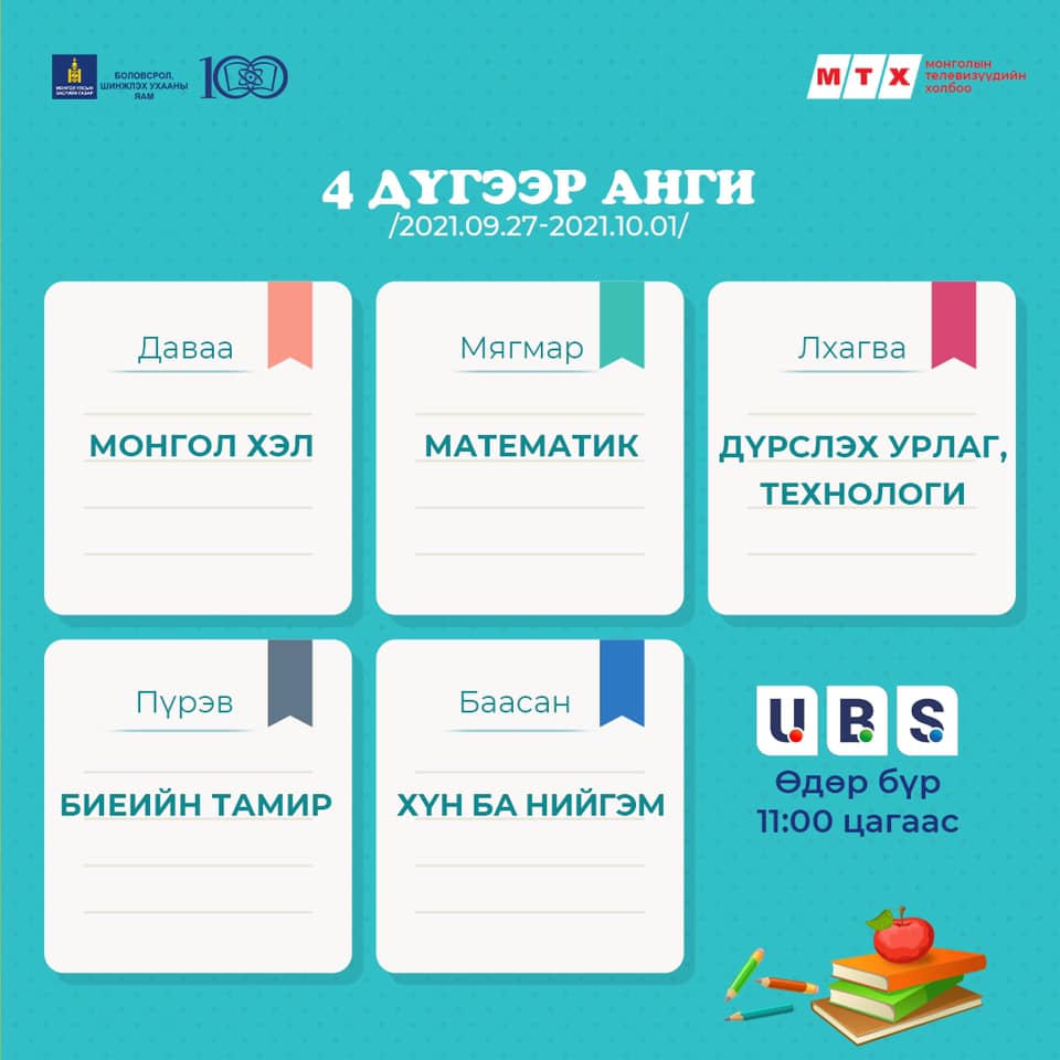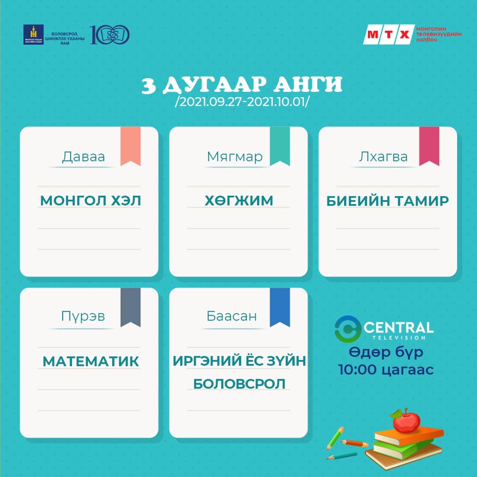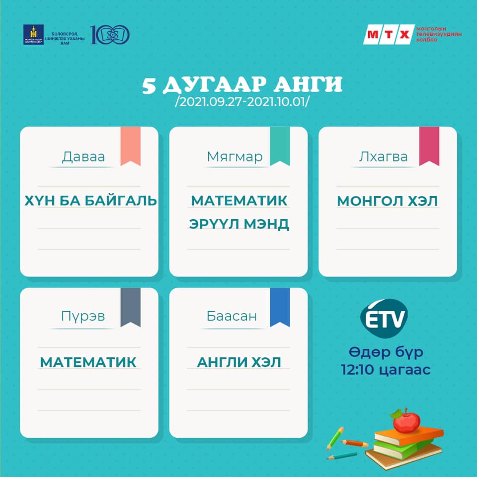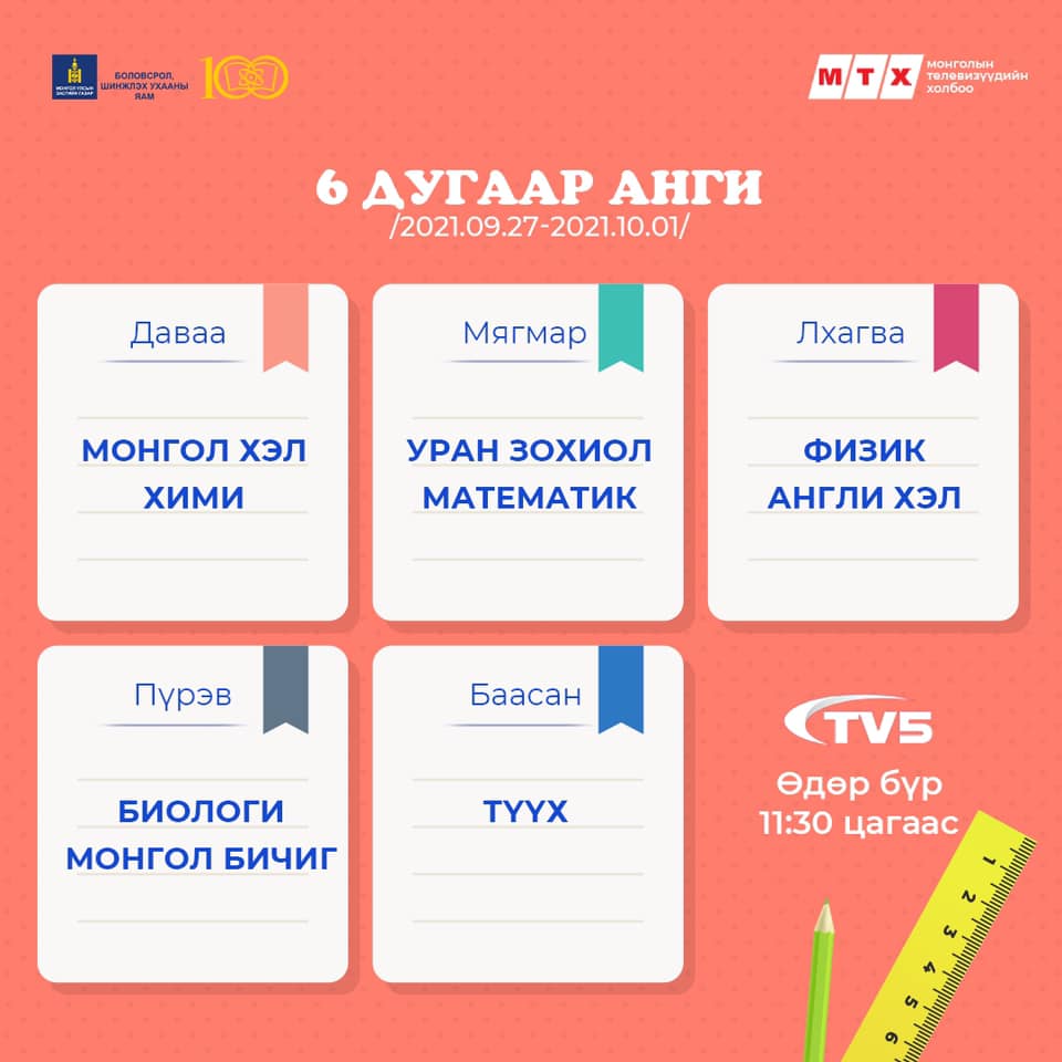 Теле хичээлийн хуваарийг Боловсролын хүрээлэнгээс долоо хоног бүр шинэчлэн хүргэх аж. Ингээд энэ долоо хоногийн теле хичээлийн хуваарийг хүргэж байна.