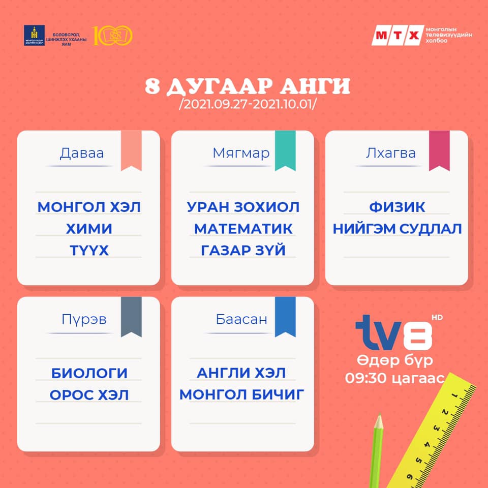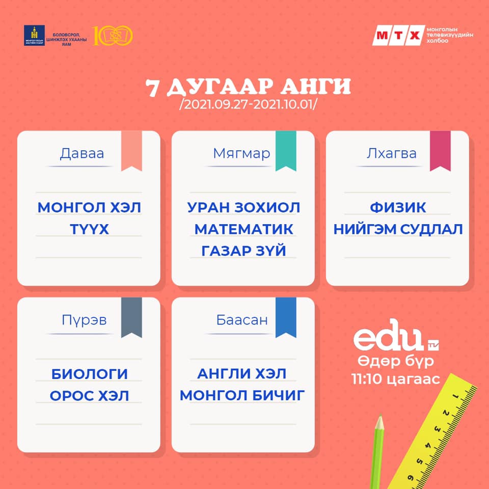 Энэ долоо хоногийн теле хичээлийн хуваарь