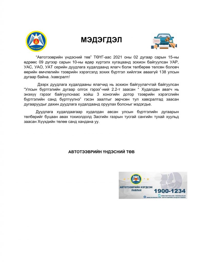 Уг мэдэгдэлд автомашины улсын дугаарын дуудлага худалдаагаар худалдан борлуулагдсан УАР, УАС, УАО, УАТ сери бүхий дугаарууд төлбөрөө төлсөн боловч өөрийн өмчлөлийн тээврийн хэрэгсэлд зохих бүртгэл хийлгэж аваагүй 138 улсын дугаар байгааг дурджээ. Иймд дээрх сери бүхий дугааруудыг дахин дуудлага худалдаанд оруулахаар төлөвлөж буй гэнэ.