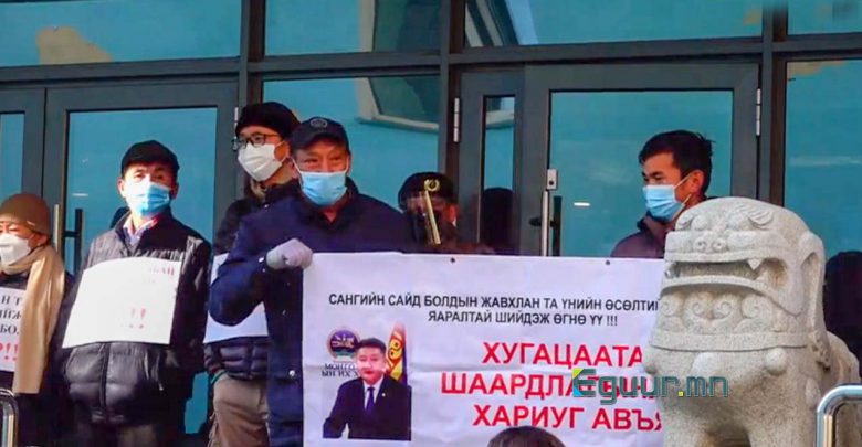 Барилгачид Сангийн яамны гадна жагсаж байна. Энэ үеэр барилгачдын төлөөлөл байр сууриа илэрхийллээ.