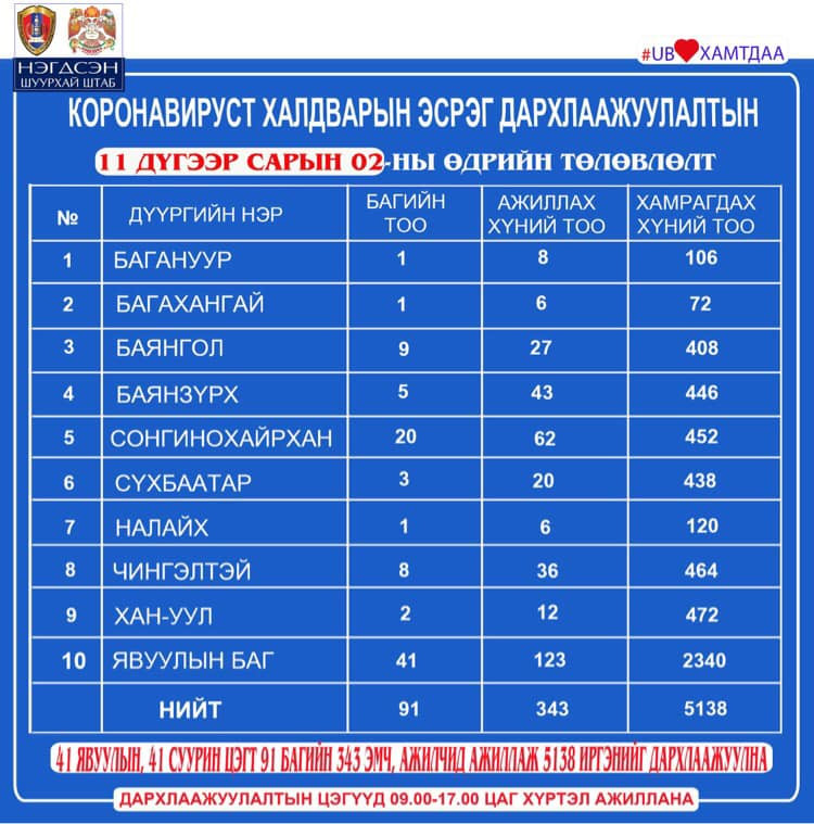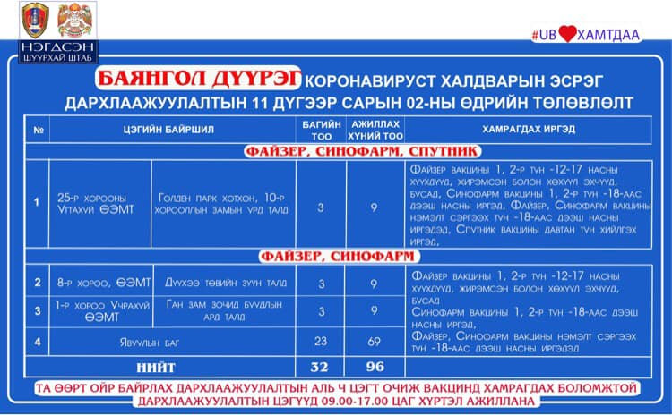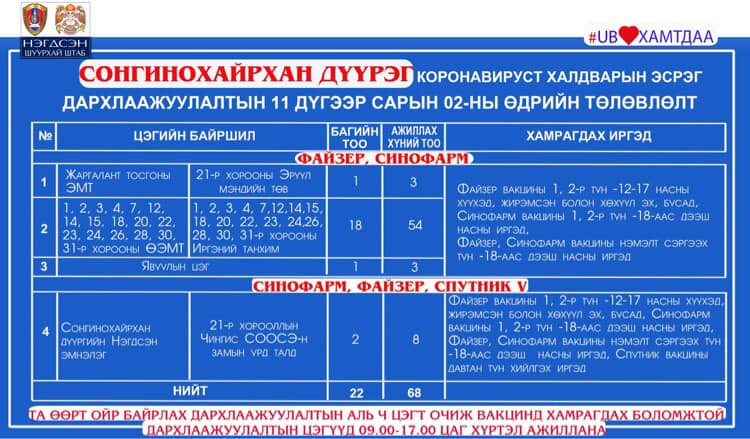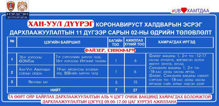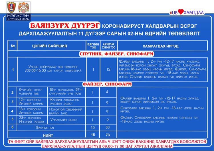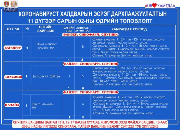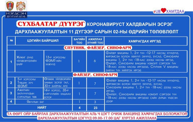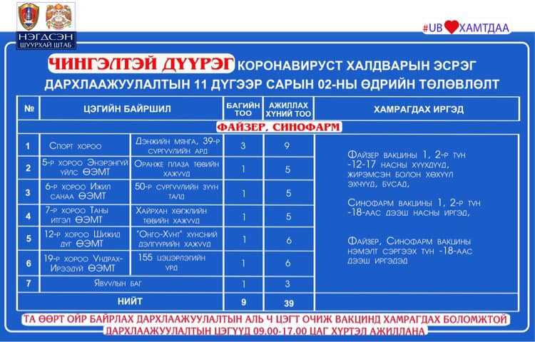 Өнөөдөр буюу арваннэгдүгээр сарын 2-нд Улаанбаатар хотод явуулын 41 баг, суурин 41 цэгт 91 багийн 343 эмч, ажилтан ажиллаж, 5138 иргэнийг дархлаажуулахаар төлөвлөжээ. Та өөрт ойр вакцины аль ч цэгт очиж дархлаажуулалтад хамрагдах боломжтой. Дархлаажуулалтын цэгүүд 09:00-17:00 цаг хүртэл ажиллана.