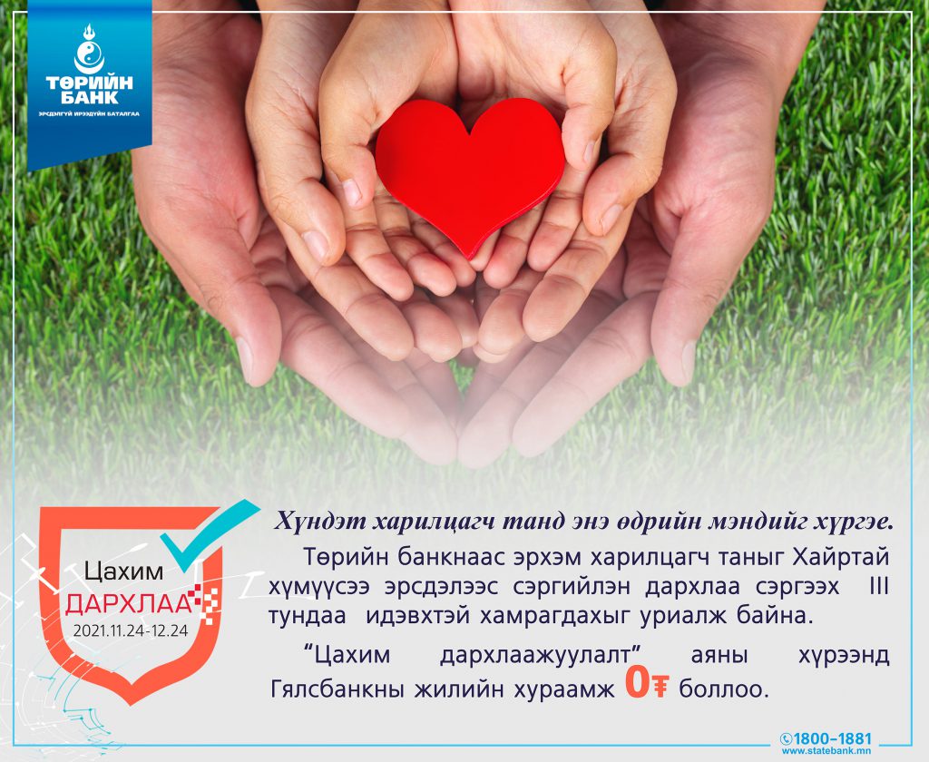 Төрийн банк эрхэм харилцагч таныг КОВИД-19 цар тахлын эсрэг вакцины III тундаа хамрагдахыг уриалж “Цахим дархлаажуулалт”-ын аянаа зарлаж байна. Тус аяны хүрээнд бид орон даяар байрлах 500 гаруй салбар нэгжээрээ дамжуулан 2021 оны 11 дүгээр сарын 24-нөөс 12 дугаар сарын 24-нийг дуустал хугацаанд III тунд хамрагдсан бол Гялсбанкны жилийн хураамжаас чөлөөлж байна. Мөн дэлхийд алдартай антивирус, цахим хамгаалалтын системийн Монгол дахь албан ёсны дистрибъютер компани болох “Бд Системс эйжиа” ХХК-тай хамтран вакцины III тундаа хамрагдсан эхний 20,000 харилцагчид Bitdefender Mobile security программын нэг жил үнэгүй ашиглах эрх олгохоор боллоо.