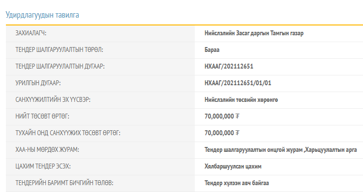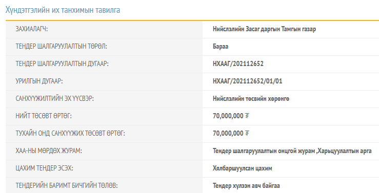 Нийслэлийн Засаг даргын тамгын газрын арванхоёрдугаар сарын 08-ны өдөр зарласан тендерийн мэдээг баримт болгон хавсаргав.