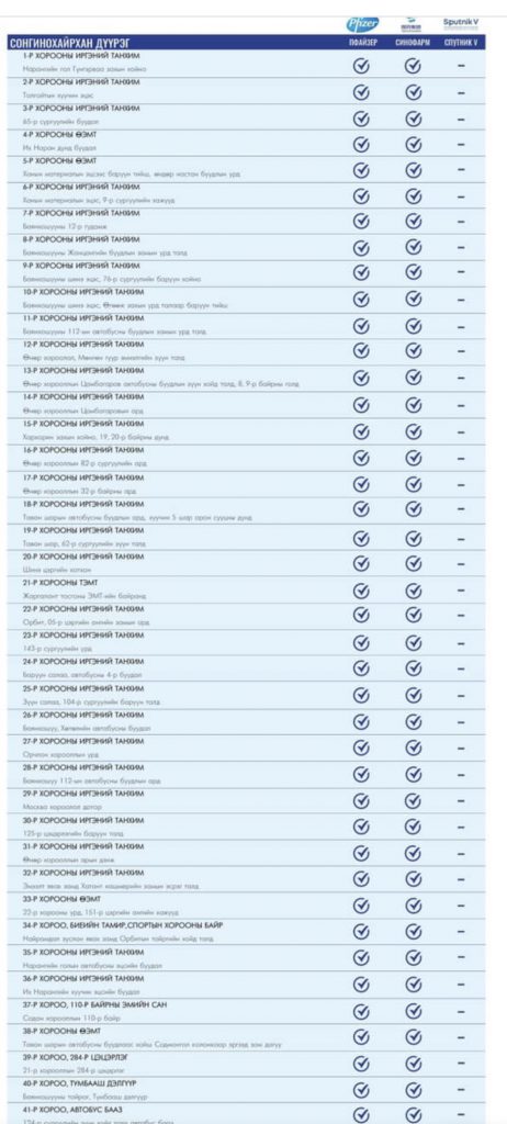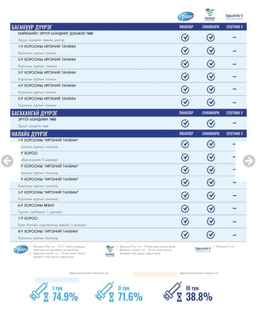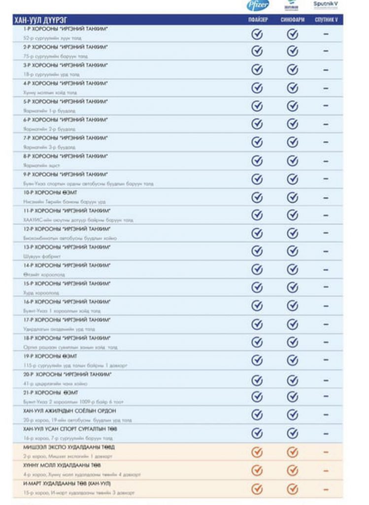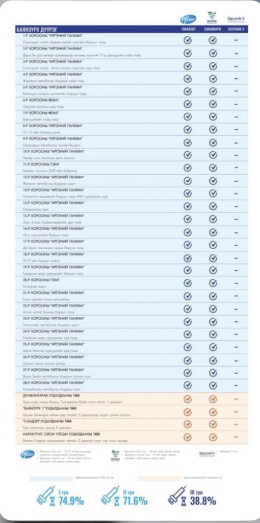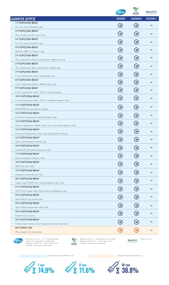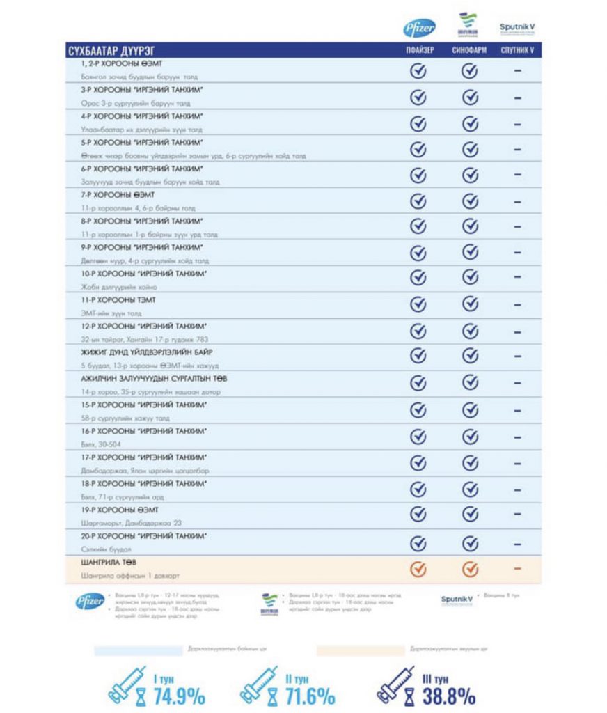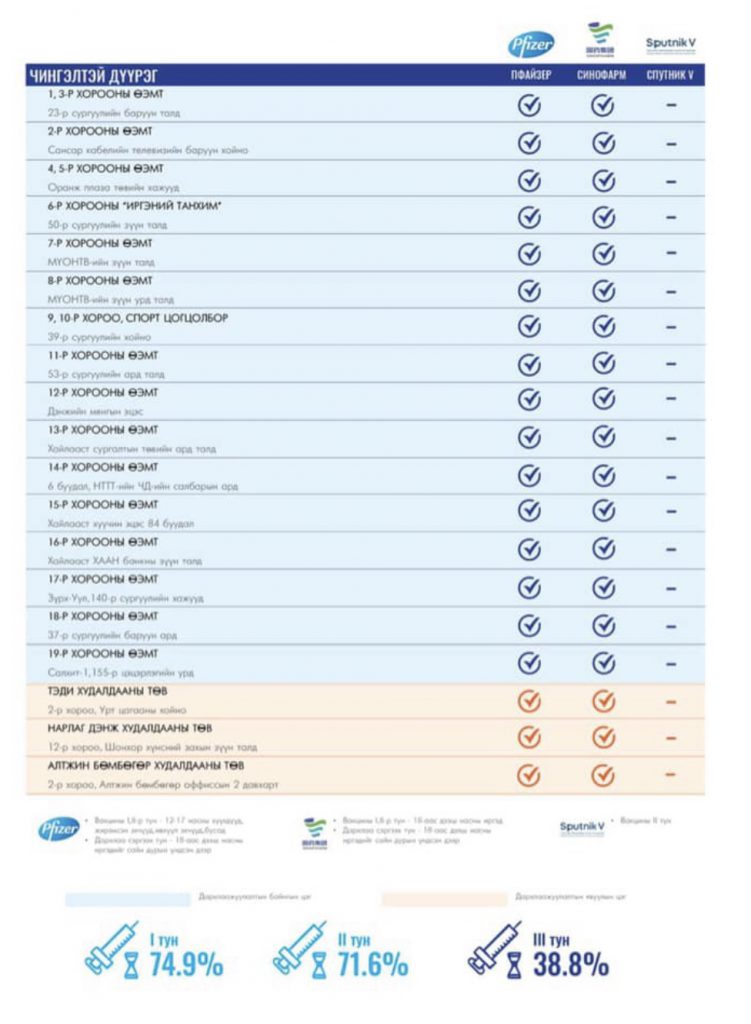 Та өөрт ойр вакцины аль ч цэгт очиж дархлаажуулалтад хамрагдах боломжтой. Дархлаажуулалтын цэгүүд 10:00-20:00 цаг хүртэл ажиллана.