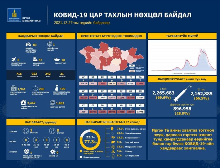Харамсалтай нь, өнгөрсөн өдөр 61-80 насны НЭГ хүн Covid-19 халдварын шалтгаант хүндрэлээр нас барсан бөгөөд хавсарсан эмгэгтэй байжээ. Өнөөдрийн байдлаар эмнэлэгт 1,941 хүн эмчлүүлж буйн 31 нь нэн хүнд байна. Мөн 298 хүүхэд, 109 жирэмсэн эмэгтэй хэвтэн эмчлүүлж байна.
