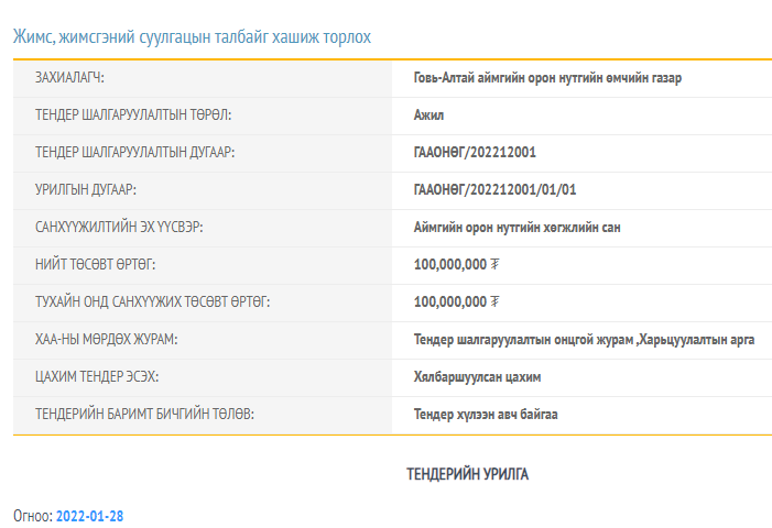 Уг тендерийг нэгдүгээр сарын 28-ны өдөр буюу өнгөрсөн баасан гарагт зарлажээ. Харин урилга хүлээн авах сүүлийн хугацааг хоёрдугаар сарын 28-ныг хүртэл гэж тусгасан байна.