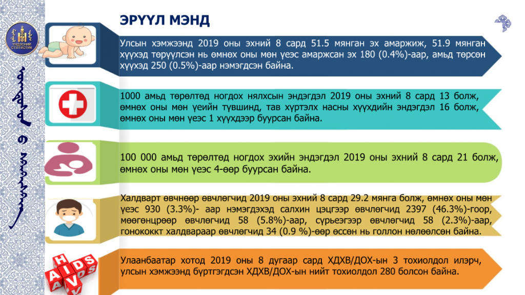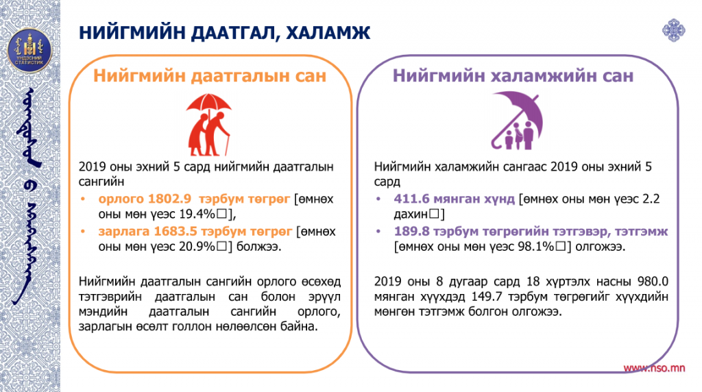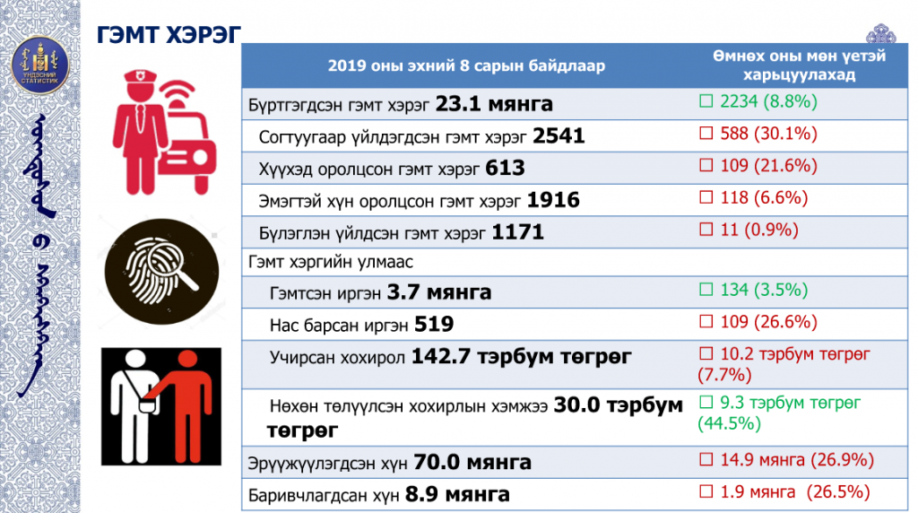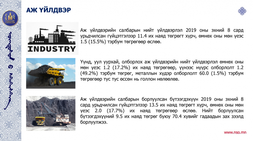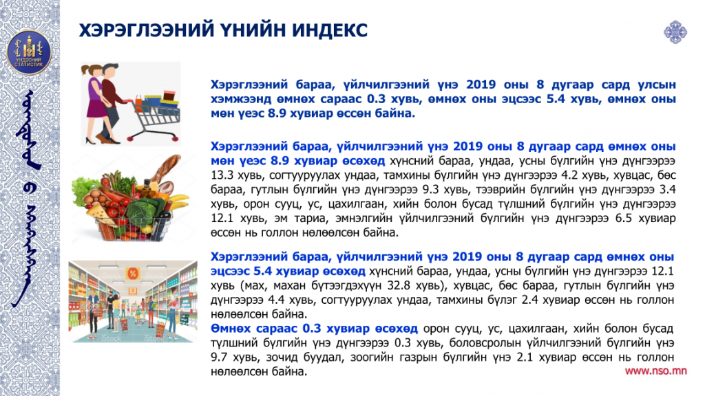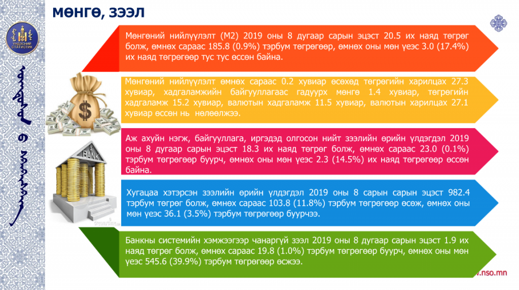 Үндэсний статистикийн хорооноос 2019 оны эхний найман сарын байдлаарх Монгол Улсын нийгэм, эдийн засгийн нөхцөл байдлыг танилцууллаа. Статистик мэдээллийн дэлгэрэнгүйг дараах байдлаар хүргэж байна.