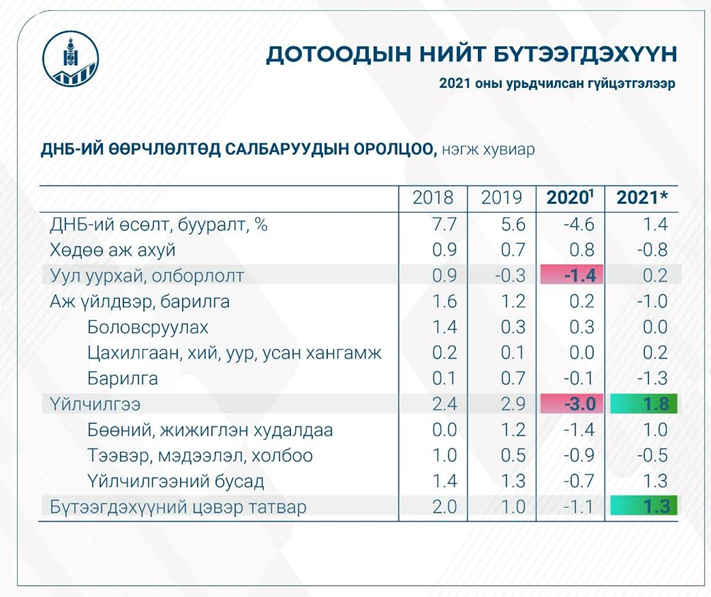 2020 онд цар тахлын нөлөөгөөр 4.6% агшсан эдийн засагт хэдийгээр сэргэлт бий болсон ч өсөлтийн задаргаанаас харахад салбаруудын байдал эмзэг хэвээр байна. Уул уурхай, эрчим хүч, худалдаа, үйлчилгээний зарим салбарууд даруухан өсөлт үзүүлжээ. Харин бусад салбар агшилттай байсан нь бизнесийн орчин хүнд, компани аж ахуйн нэгжүүдэд сорилтын жил болсныг илтгэнэ.
