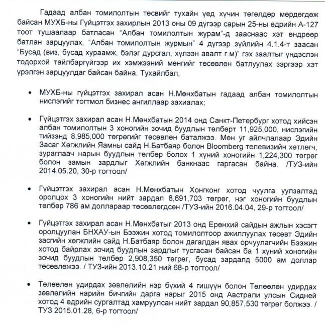 Эл тайлангаас харвал Хөгжлийн банкны захирал асан Н.Мөнхбатын албан томилолтод зориулж, тодорхой тайлбаргүйгээр их хэмжээний мөнгийг төсөвлөн батлуулах зэргээр хэт үрэлгэн зарцуулдаг байсан байна.