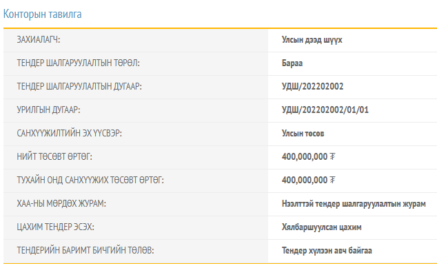 Улсын дээд шүүх өнгөрсөн гуравдугаар сарын 23-ны өдөр тавилга авах тендер зарласан байна. Ингэхдээ "Улсын төсөв"-өөс эл хөрөнгийг гаргуулна хэмээн цохон дурджээ. Тендерийн талаар дэлгэрэнгүй танилцуулбал "Конторын тавилга" нэрээр зарласан байгаа юм.