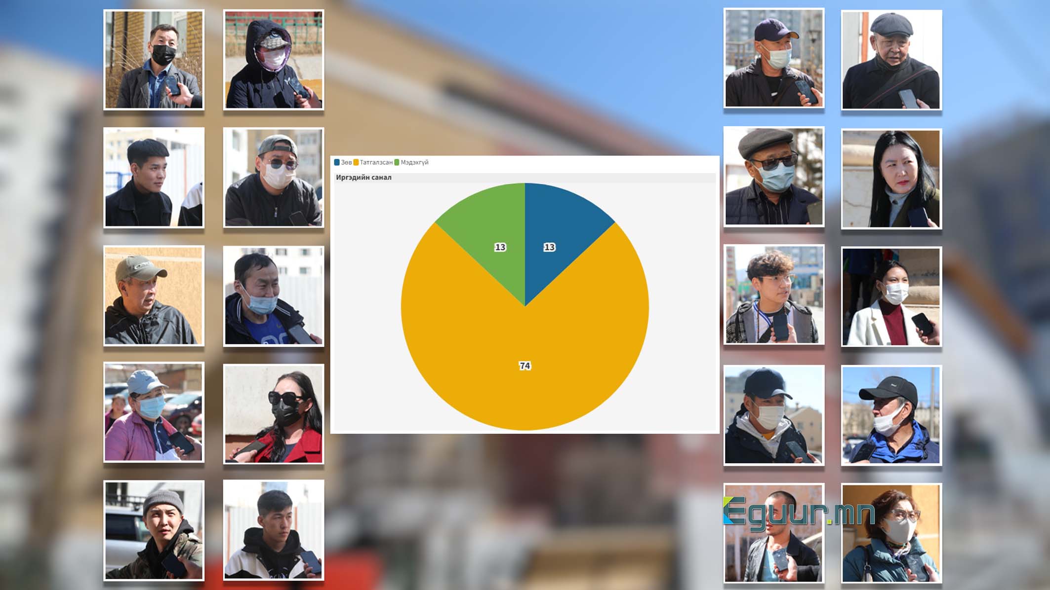 Санал асуулгад оролцсон 15 иргэний хоёр нь хороо байгуулах нь зөв гэж үзсэн бол хоёр иргэн мэдэхгүй, үлдсэн 11 иргэн татгалзсан саналыг өгчээ. Өөрөөр хэлбэл, 74 хувь нь татгалзсан санал өгсөн гэсэн үг. Үүнийг хувьчилж үзүүлбэл:
