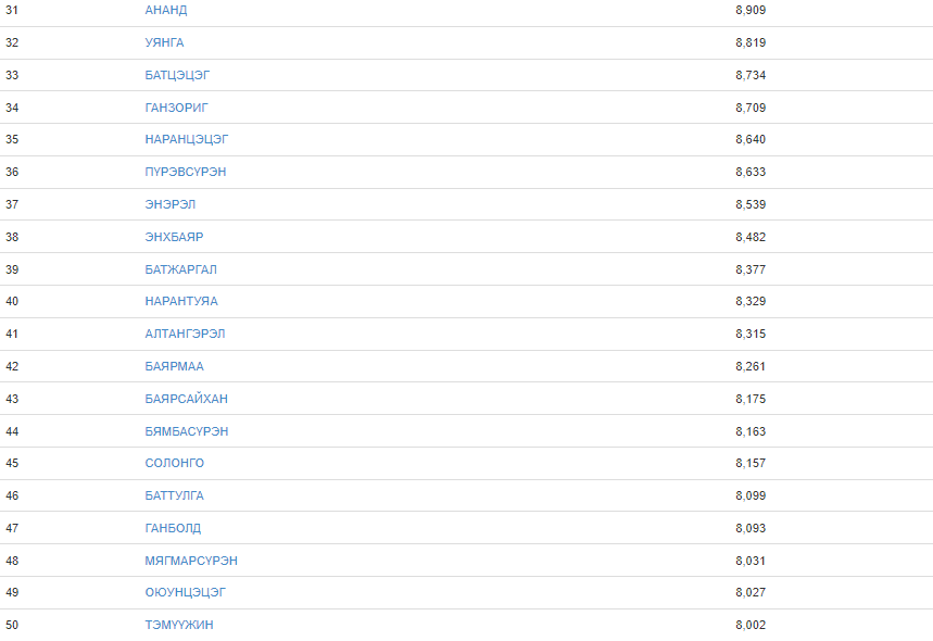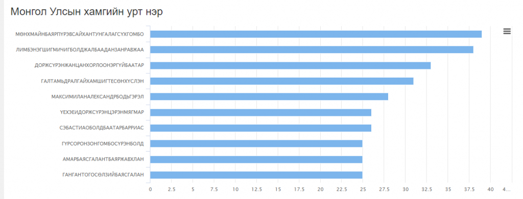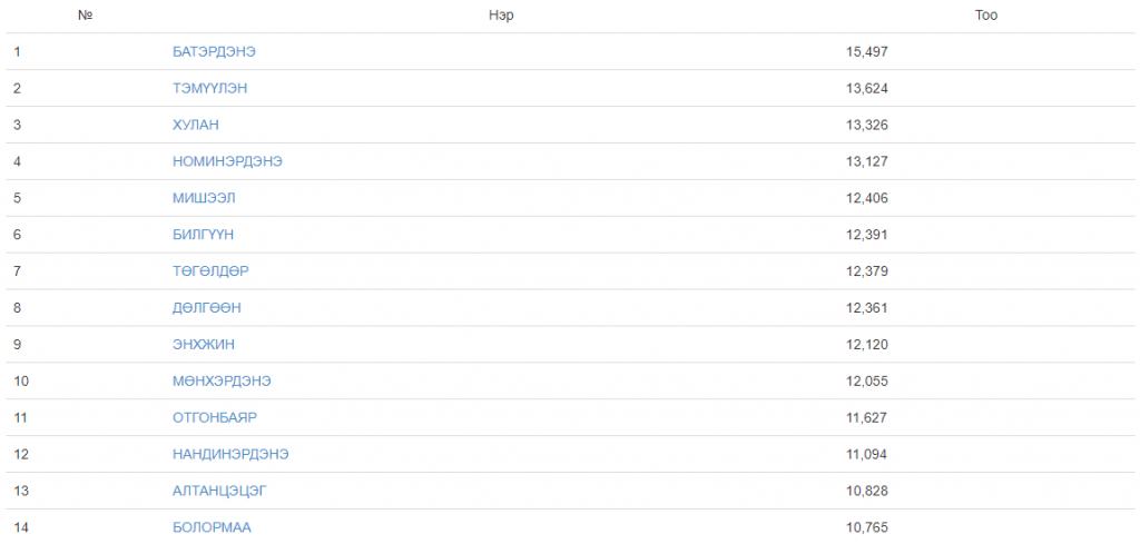Харин хамгийн түгээмэл нэрийн жагсаалтыг Бат-Эрдэнэ тэргүүлжээ. Монголд Бат-Эрдэнэ гэх нэртэй 15,497 хүн байна. Харин Тэмүүлэн гэдэг нэртэй хүн 13,624 байна.