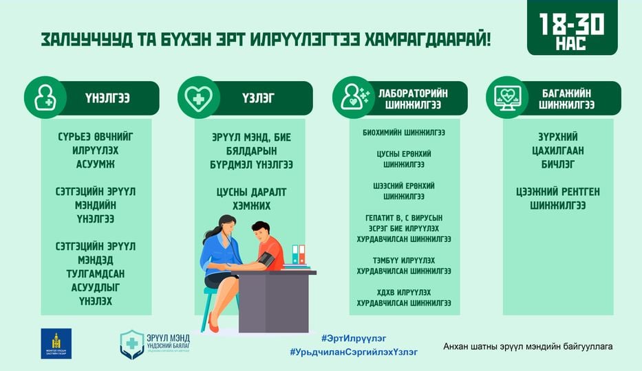 Тавдугаар сарын 1-нээс буюу өчигдрөөс орон даяар 0-5 болон 18-аас дээш насны бүх иргэдийг эрүүл мэндийн үзлэг, оношилгоонд үнэгүй хамруулах ажил эхэллээ. Энэ дагуу салбарын яамнаас мэдээлэл хийхдээ иргэдийг үзлэгт хамруулах график төлөвлөгөөг гаргасан. Эрт илрүүлэг үзлэг, оношилгоо бүтэн жилийн турш явагдана. Мөн орон нутагт 15 аймгийн нэгдсэн эмнэлэгт дэмжих төвийг байгуулсан. Зарим аймгуудад мөн адил дэмжих төвийг ашиглалтад оруулан ажиллаж байгаа.