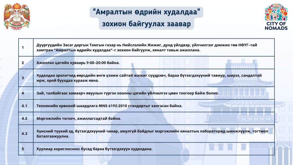 Нийслэлийн иргэдийн хөдөлмөр эрхлэлтийг дэмжих, худалдаа, үйлчилгээ чөлөөтэй эрхлэх нөхцөлийг бүрдүүлэх, орлогыг нэмэгдүүлэх зорилгоор нийтийн эзэмшлийн талбайд “Амралтын өдрийн худалдаа” зохион байгуулж эхэлсэн. Ингэхдээ нийслэлд жижиг, дунд үйлдвэр, үйлчилгээ эрхэлж буй үндэсний үйлдвэрлэгчдийг илүүтэй хамруулахаар зорьж буй юм.