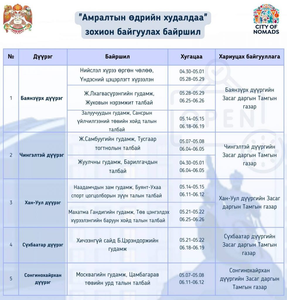 Хуваарьт өдрүүдэд “Амралтын өдрийн худалдаа”-г зохион байгуулах үүргийг дүүргүүдийн Хүнс, худалдаа үйлчилгээний хэлтэс  хариуцах бөгөөд талбайн хэмжээндээ тохируулан жижиг, дунд үйлдвэрлэл эрхлэгчид болоод худалдаа, үйлчилгээ эрхлэгчдийг хамруулах юм.