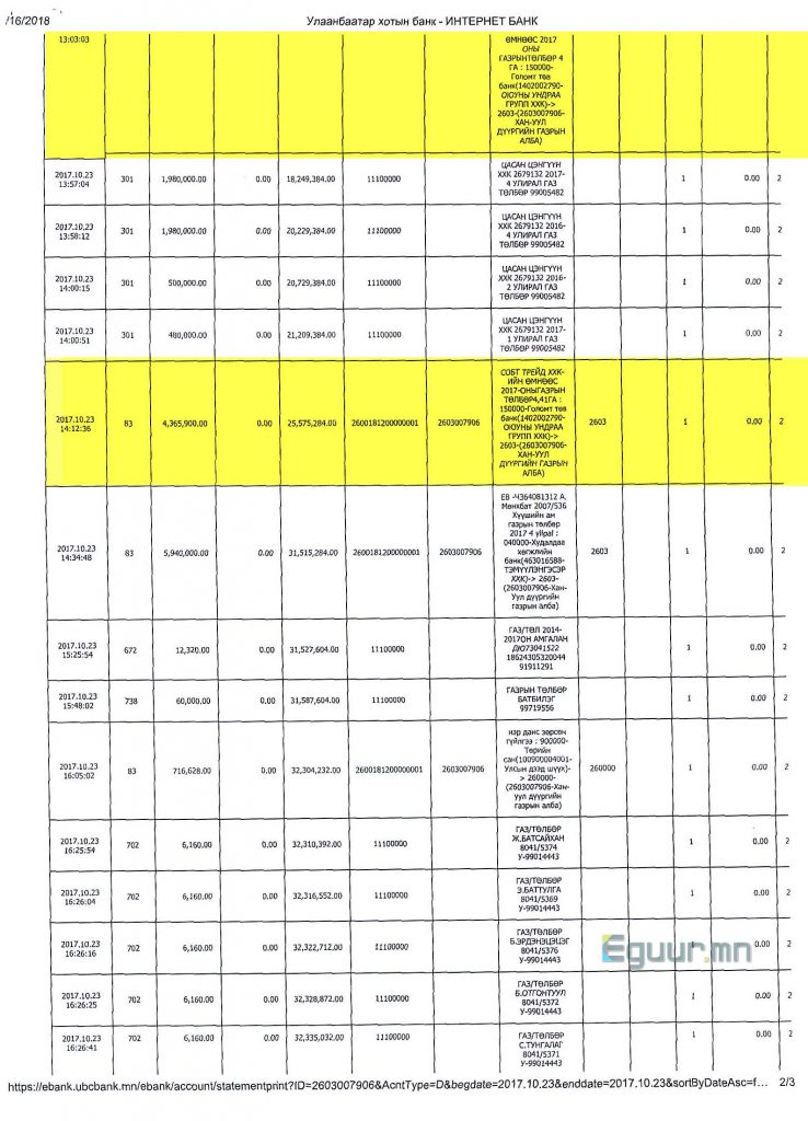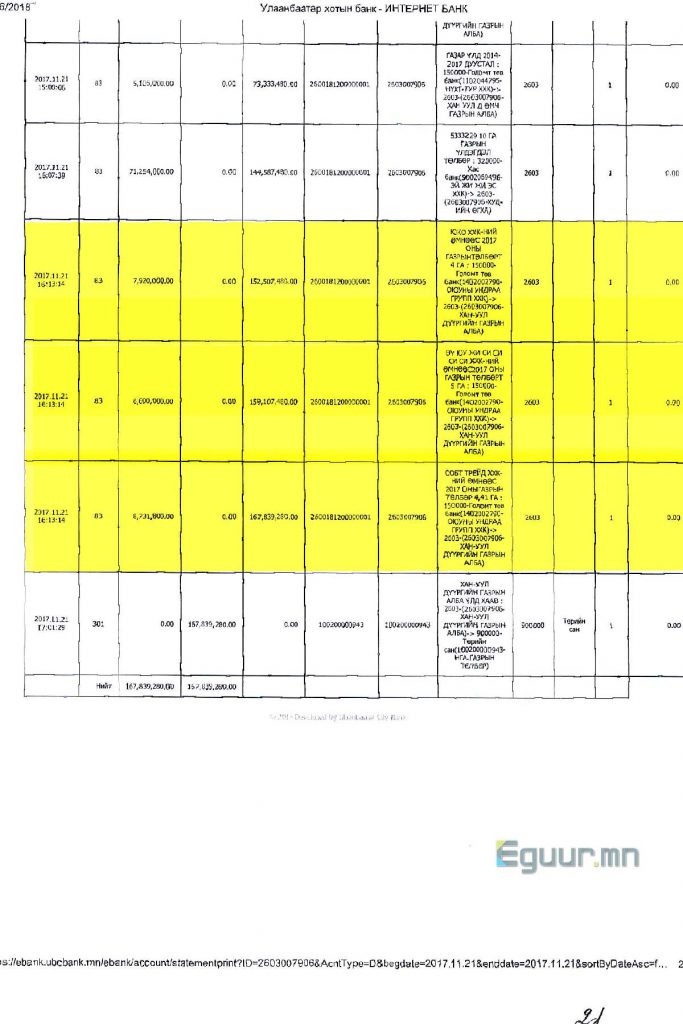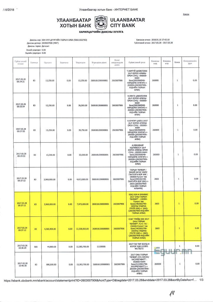 Тайлбар: Хан-Уул дүүргийн газрын албаны дансны 2017 оны үеийн хуулга. Үүнд "Оюуны ундраа групп"-ээс "Собттрейд", "Юко", "Өү Юу Жи Си Си Си Си" ХХК-иудын нэр дээрх газрын төлбөрийг төлж ирсэн нь харагдаж байна