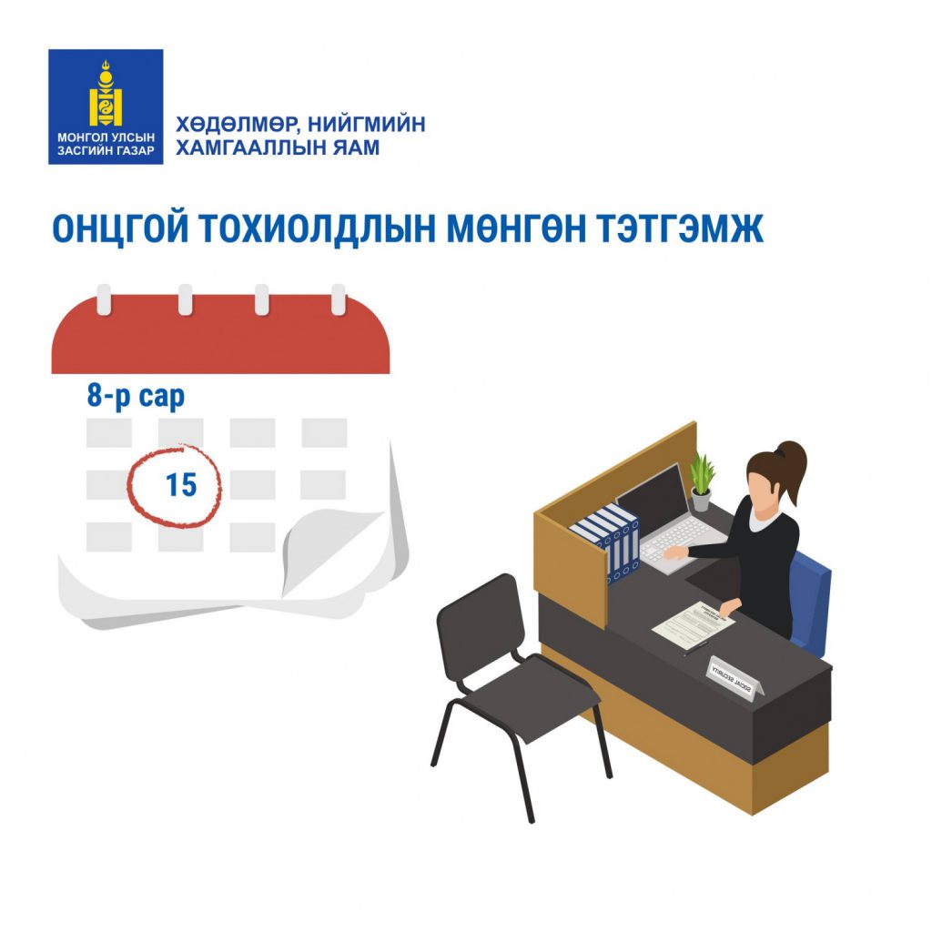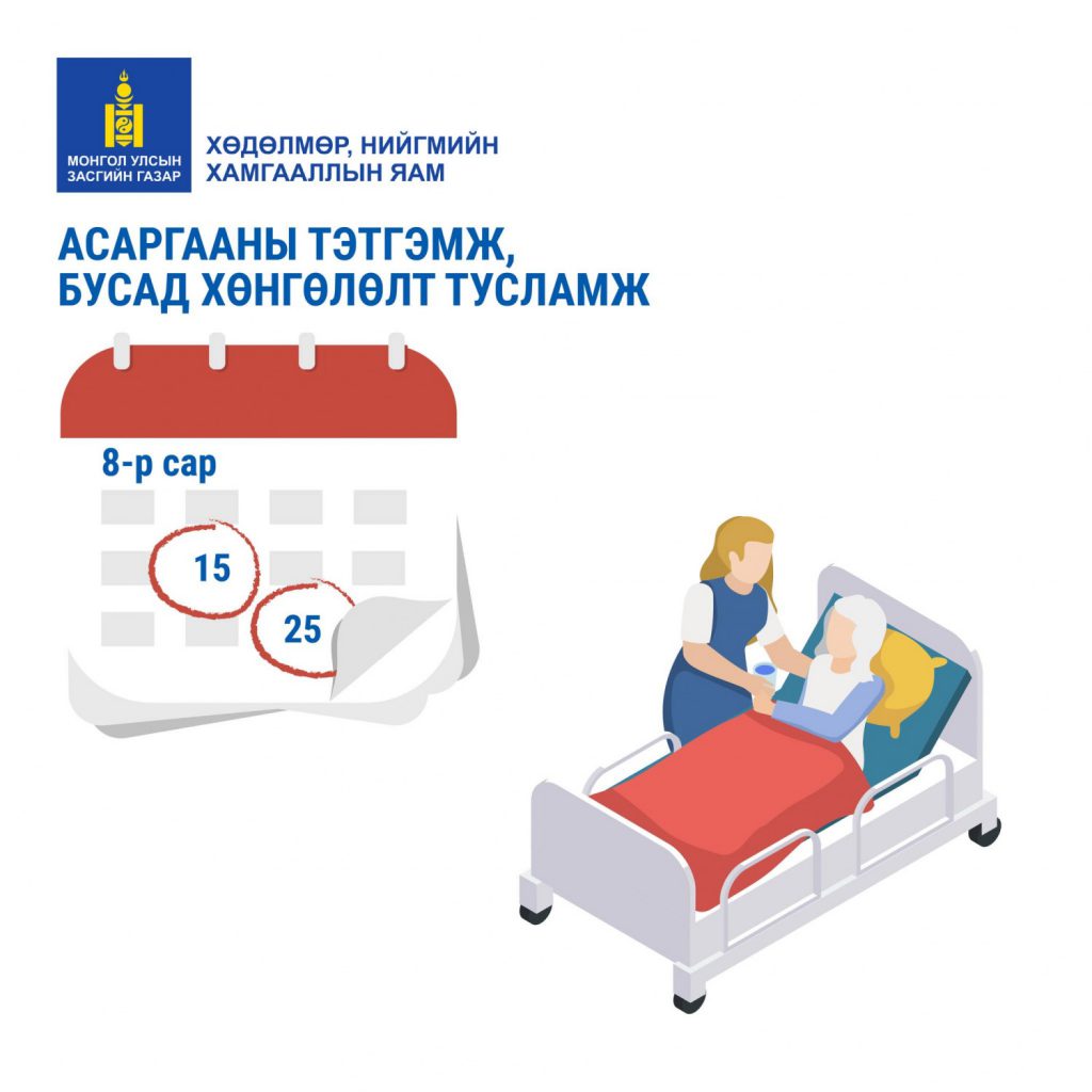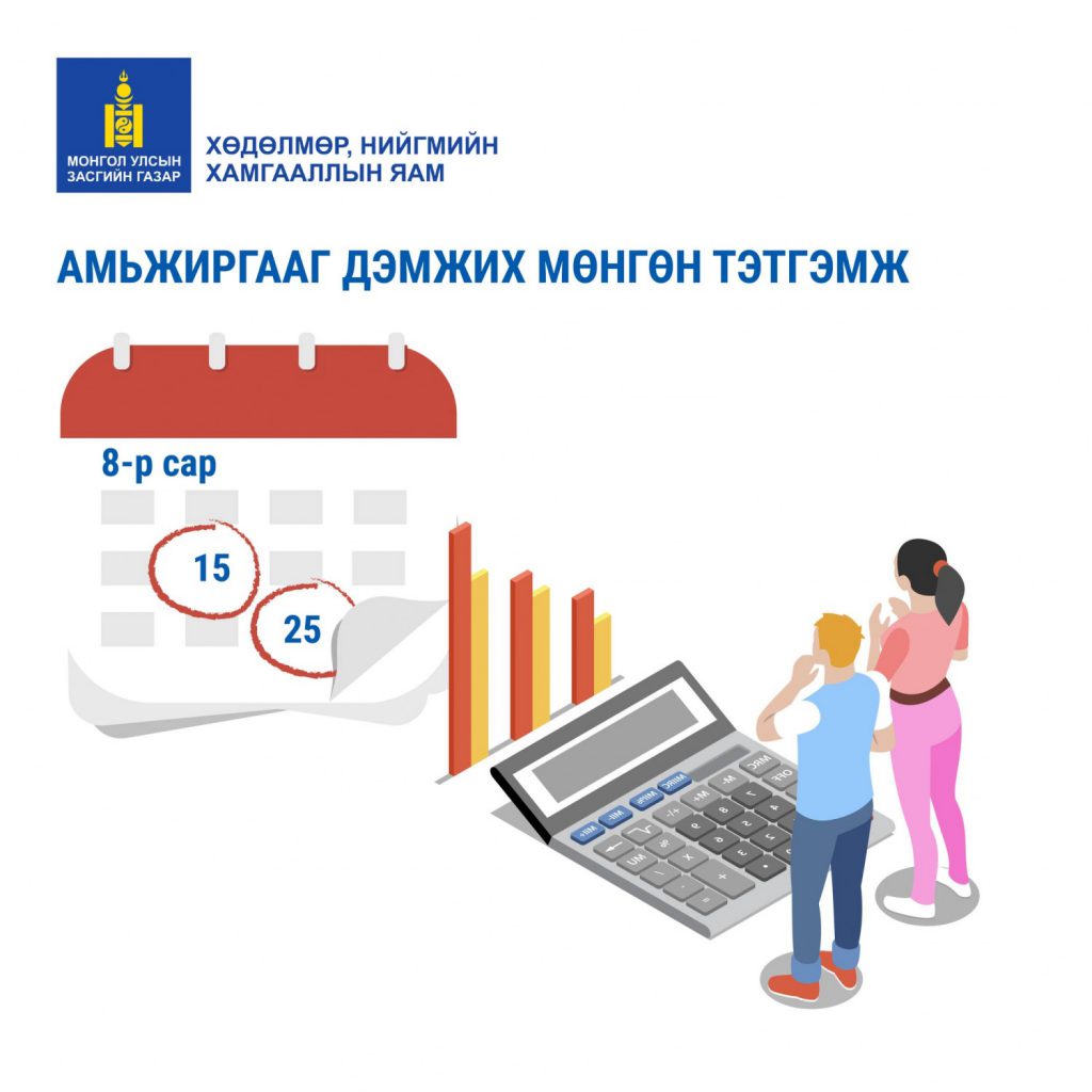 Нийгмийн халамжийн тэтгэвэр, тэтгэмж, хөнгөлөлт, тусламжийг наймдугаар сард олгох хуваарийг Хөдөлмөр, нийгмийн хамгааллын яамнаас танилцуулжээ. Үүнээс харахад хүүхдийн мөнгийг энэ сарын 22-ноос олгож эхлэх нь.