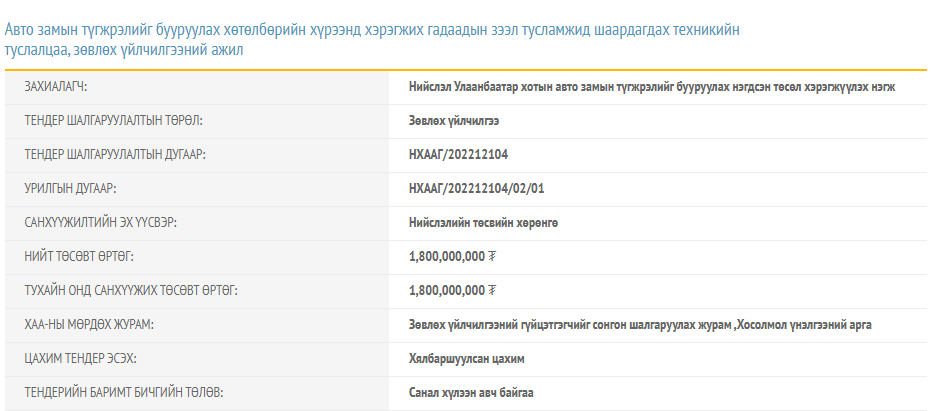 Тодруулбал, Нийслэл Улаанбаатар хотын авто замын түгжрэлийг бууруулах нэгдсэн төсөл хэрэгжүүлэх нэгж "Авто замын түгжрэлийг бууруулах хөтөлбөрийн хүрээнд хэрэгжих гадаадын зээл тусламжид шаардагдах техникийн туслалцаа, зөвлөх үйлчилгээний ажил" гэсэн утгатайгаар 1.8 тэрбумын тендер зарлажээ. Ингэхдээ зардлыг "Нийслэлийн төсвийн хөрөнгө"-өөс гаргана гэжээ.