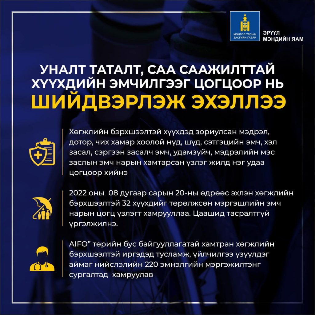 Мөн мэдрэлийн ёзоор тайрах хагалгааг Монголд нэвтрүүлж, хөгжлийн бэрхшээлтэй хүүхдүүдийг жилд нэг удаа төрөлжсөн нарийн мэргэжлийн эмийн цогц үзлэгт хамруулж эхэллээ.