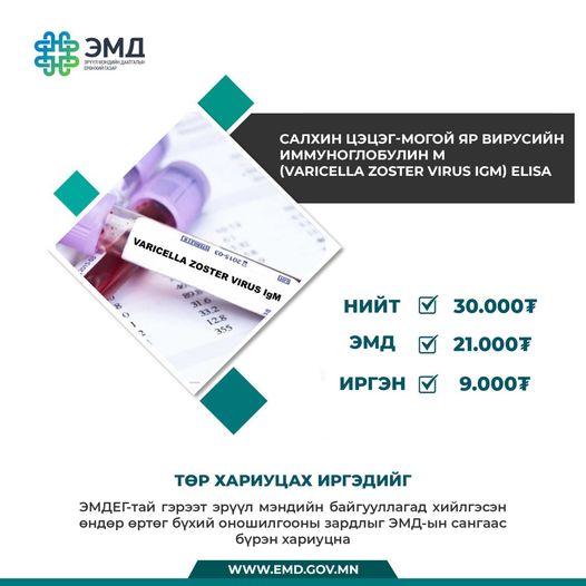 ЭМДЕГ-ын даргын 2022 оны "Жагсаалт батлах тухай" А/53-р тушаалаар салхин цэцэг- могой яр вирусийн иммуноглобулин М (Varicella Zoster Virus IgM-ELISA) шинжилгээг 30 мянган төгрөг байхаар зохицуулсан бөгөөд үүний 30 хувийг иргэн өөрөө хариуцан төлнө.